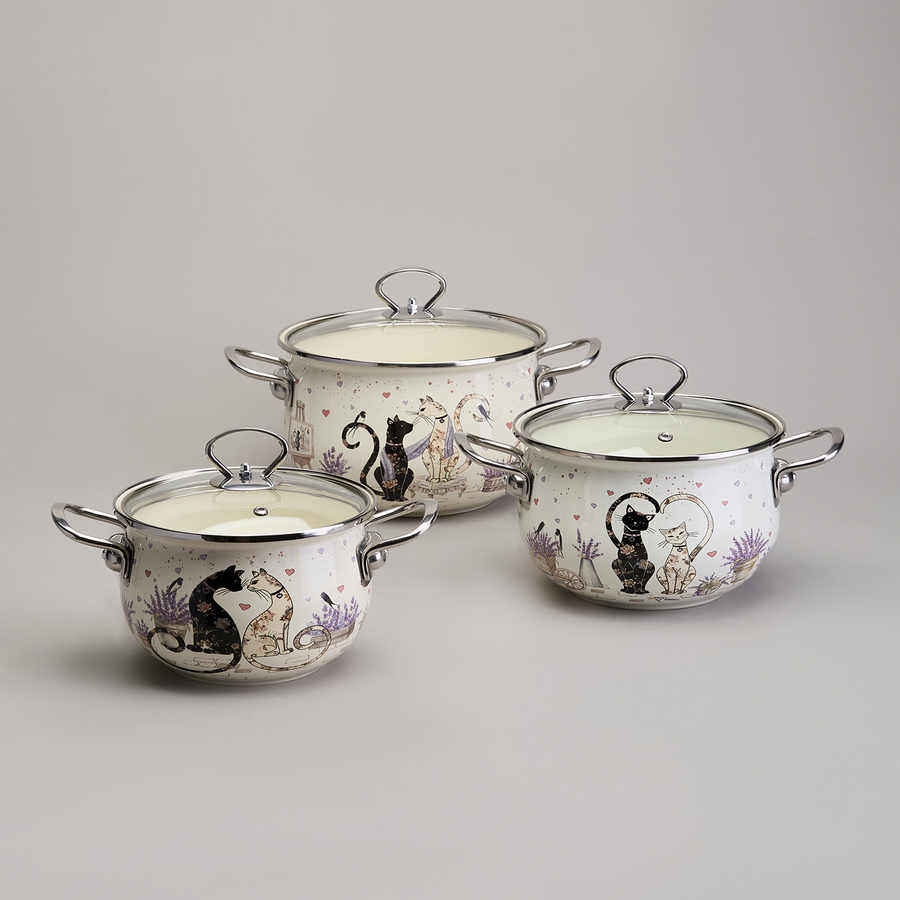 НАБОР КАСТРЮЛЬ 2,0/2,8/3,8Л ЭМАЛИРОВ.с стекл. крышк., серия "LAVENDER CATS ,(индукция) 943-107