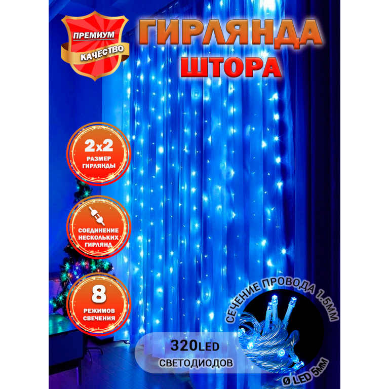 M-DL-10002 Электрогирлянда "Занавес", 320LED, синий цвет, прозрачный провод, 200*200 см